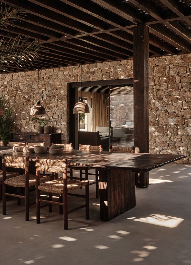 Envisioning a private house in Mykonos that draws inspiration from both Scorpios Mykonos and Soho House involves blending the rustic, earthy elegance of Scorpios with the contemporary comfort that Soho House epitomizes.